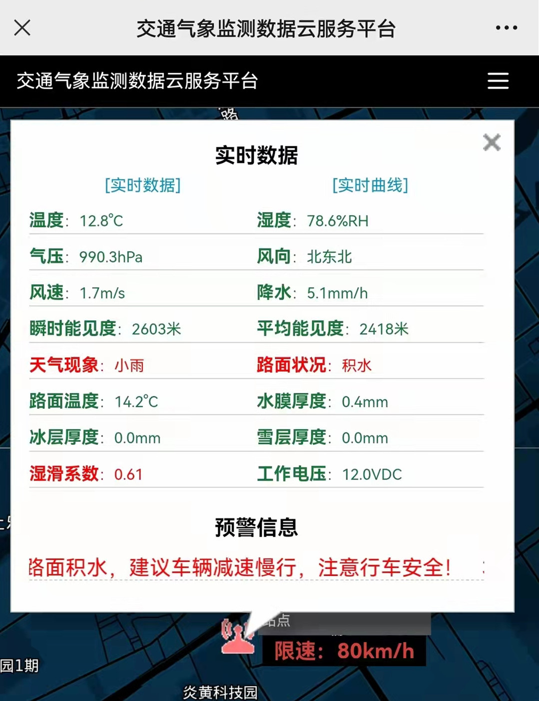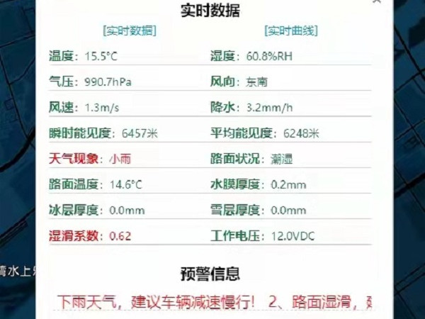 雨天情況下,其天氣現(xiàn)象,濕滑系數(shù)、路面狀況均會(huì)顯示紅色字體,及相關(guān)數(shù)據(jù)信息,并且有預(yù)警信息,提醒:下雨天氣,路面濕滑,建議車輛減速慢性,注意行車安全,并且有限速提醒。