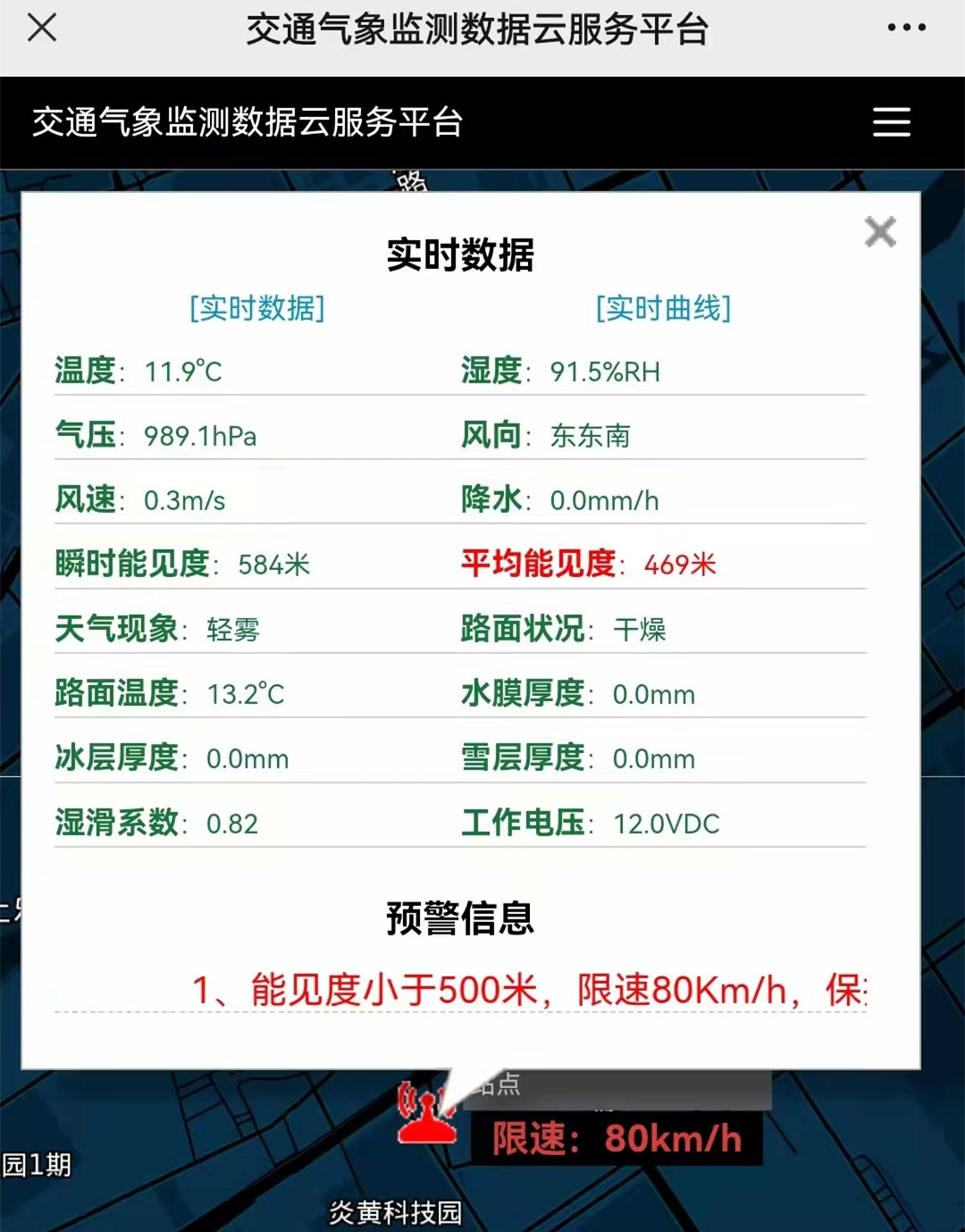 霧天情況下,在實(shí)時(shí)數(shù)據(jù)中對(duì)于平均能見度會(huì)顯示紅色字體,其能見度距離也有具體展現(xiàn),并提示預(yù)警信息:能見度小于多少米,限速多少,保持車距等相關(guān)提醒。