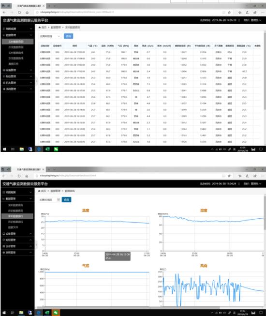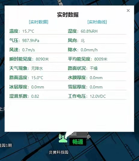 在監(jiān)測平臺(tái)中,實(shí)時(shí)數(shù)據(jù)主要展現(xiàn)數(shù)據(jù)有:溫度、氣壓、風(fēng)速、瞬時(shí)能見度、天氣現(xiàn)象、路面溫度、冰層厚度、濕滑系數(shù)、濕度、風(fēng)向、降水、平均能見度、路面狀況、水膜厚度、雪層厚度、工作電壓等,不同的氣象要素可根據(jù)需求進(jìn)行定制。