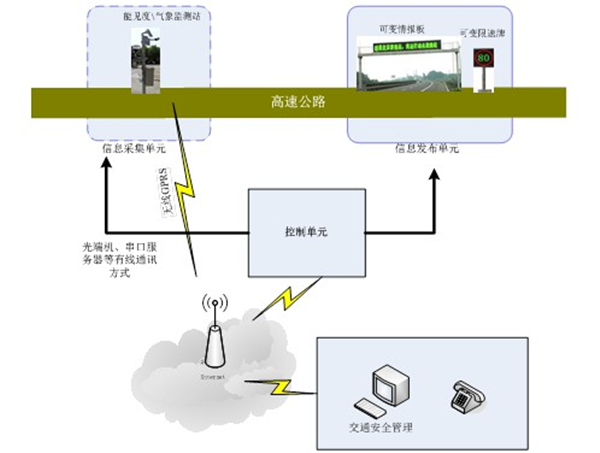 可依托高速公路上已安裝的可變限速標志,根據(jù)不同路段檢測的能見距離,實時控制各限速標志的限速值,這樣系統(tǒng)不但可及時提醒駕駛員注意前方大霧,還可向駕駛員安全速度。